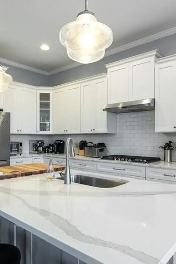 Original 1980s layout transformed. Open concept, quartz island, custom hood.